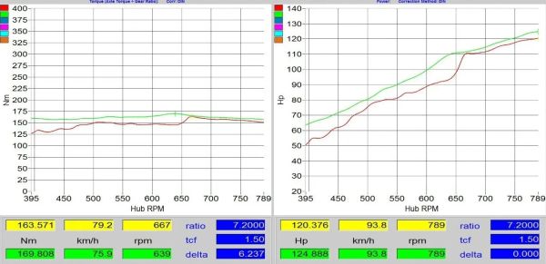 Красной линией обозначен сток, зеленой линией – прошивка АДАКТ; на графике слева – крутящий момент, на графике справа – мощность