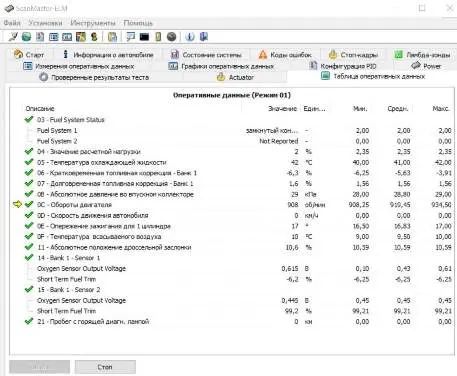 10. В Таблице с оперативными данными будут отображены значения датчиков, а также состояние систем машины.