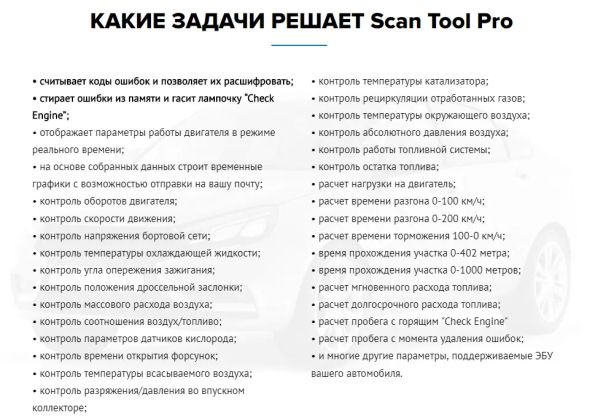 Наибольшей популярностью среди владельцев авто пользуются автосканеры, произведенные на базе чипа ELM 327. Такие устройства представлены, например, беспроводным прибором Scan Tool Pro. Устройства, помимо способности считывать ошибки, обладает таким функционалом: