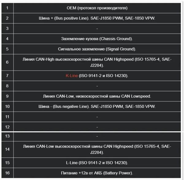 Распиновка разъема OBD2