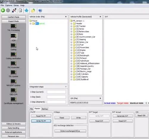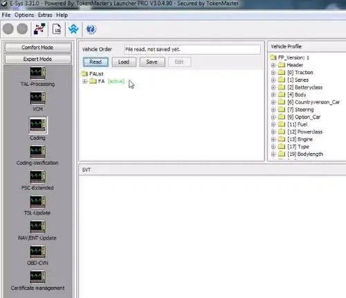 Практический пример, что как будем делать и сегодня решил показать эту функцию на такой теме, допустим вы доустановили себе вот такие клавиши Sport Comfort мод и так далее. Те. будем программировать спортивную коробку опцией 2тб, сейчас нажимаю на неё и у нас ничего не происходит, ни тут, ни тут ни какие режимы у нас не меняются, хотя должен включаться спортивный режим, нормальный режим, Спорт Плюс должно все переключаться, но ничего не работает. Мы установили всё правильно, но нужно машину закодировать. Как это сделать? Запускаем E-Sys, покажем, что можно добавлять. Подключаемся к машине. Как это правильно делать я описывал все в прошлой статье, часть 1, обязательно прочтите. Если вы этого не посмотрите, то вы скорее всего не поймете и будет много проблем. Для начала что нужно сделать? Считываем комплектация с автомобиля. Комплектацию считали ее нужно обязательно сохранить. Сохраняем ее на десктоп, называем ее orig FA, orig FA с немецкого - комплектация автомобиля. Перезапишем, т.к. я уже это делал, с этого файла обязательно сделать копию себе, сохранить ее на облако, куда угодно, чтоб была в надежном месте и не потерялась. Это для того, чтобы мы могли всегда вернуть комплектацию. Для изменения комплектации, вам нужно будет нажать на комплектации и нажать кнопочку editor, вы перейдете в FA editor, для изменения комплектации и тут нужно будет дальше нам открыть элемент саляпа.