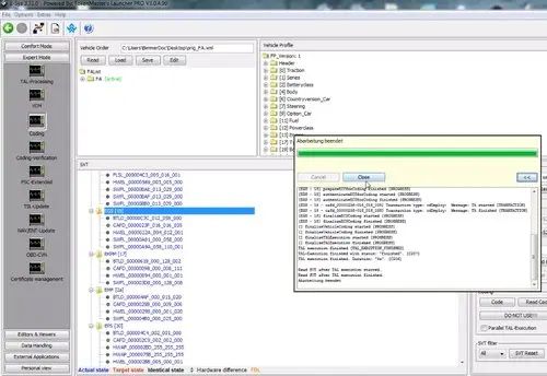 И ещё нам нужно закодировать такой модуль как kombi, т.е. саму приборку, тоже самое сейчас начнём code и включим телефон на запись, увидите, что происходит при кодировании kombi. Вот пошло кодирование модуля. Сейчас на приборке будет куча разных ошибок и так далее. Также ошибки выскакивают у нас и сюда – инструмент кластеров, update reсwire. Тут чего только не напишет. Не переживайте, потом, когда все сделается, все будет нормально. Так все, кодировка у нас завершена, переходим к E-Sys. Смотрим, close 0 erros, отлично!