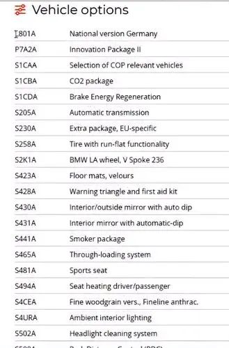 В данном случае, вы с машины считали свою комплектацию, либо посмотрели на сайте, какая комплектация была у вас с завода, но это не все опции, которые существуют у BMW. Чтобы узнать все опции, которые существуют у BMW нужно найти все комплектаций, например, очень удобно иметь это в ПДФ файлике, у себя на компьютере, потому что не всегда есть доступ к интернету и тут вы уже видите абсолютно все опции, которые BMW выпускала с новыми машинами, опции добавляются, они идут все в определенном порядке и тут есть всё всё всё. Чтобы расшифровать свою комплектацию, пользуйтесь шпаргалкой и соответственно, чтобы добавлять новые опции и знать, что вы прописываете и что вы удаляете обязательно смотрите полный список комплектации.