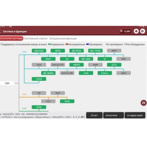 Цветовая индикация блоков управления в топологии позволяет быстро определить их статус. Зеленый цвет указывает на нормальное состояние без ошибок, красный - на наличие ошибок, синий - на сканирование без определения ошибок, а белый - на несканированные блоки. Эта визуализация значительно упрощает процесс анализа и обнаружения проблем.