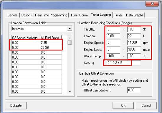 В левой таблице идет сравнение напряжения и выдается AFR. Правая часть таблички ответственная за то, на каких оборотах, на какой передаче, при каких температурных показателях ОЖ снимать значения. Тут предоставляется полная картина, по мере приобретения опыта вы сами будете понимать, что нужно будет мерить, а что не нужно.