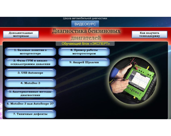 Відеокурс Олексія Пахомова "Діагностика бензинових двигунів. Експерт". Цей відеокурс створений для професіоналів та ентузіастів, які прагнуть поглибити свої знання в діагностиці бензинових двигунів. Курс допоможе освоїти роботу з мотортестерами, аналізувати сигнали та ефективно виявляти несправності.