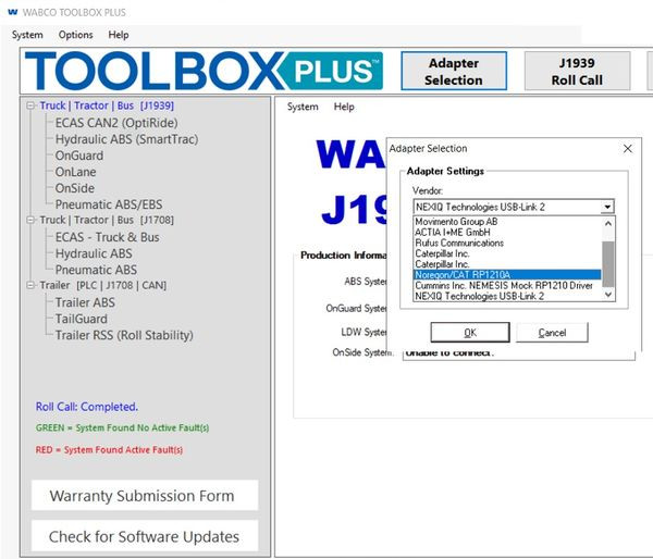 Таким образом, WABCO Toolbox Plus рассчитан на работу с профессиональными диагностическими интерфейсами для грузового транспорта: оригинальными адаптерами WABCO и мультимарочными RP1210-устройствами для грузовиков, автобусов и прицепной техники. Использование бытовых или легковых адаптеров с этой программой не предусмотрено.