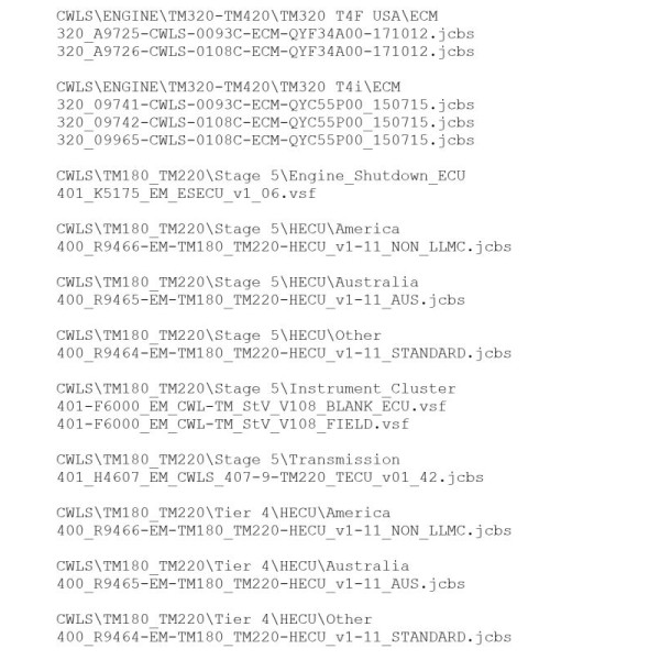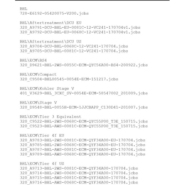 - Обновленные файлы прошивок: Набор содержит актуальные прошивки для различных моделей и типов техники JCB, включая экскаваторы, тракторы, погрузчики и другую строительную и сельскохозяйственную технику.