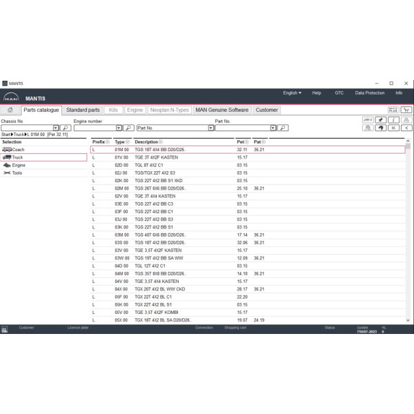 MAN Mantis EPC — электронный каталог оригинальных запчастей для грузовых автомобилей MAN, автобусов MAN и NEOPLAN, а также шасси под спецнадстройки. Каталог помогает быстро находить детали по VIN/FIN, по моделям и агрегатам, показывает узлы в разрезе, актуальные номера с заменами, применяемость по годам выпуска и конфигурации. Инструмент предназначен для СТО, отделов снабжения и складов запчастей.