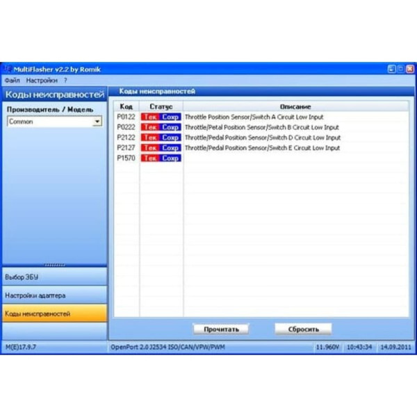 - Чтение и запись прошивок: позволяет считывать и записывать полные прошивки ЭБУ через диагностический разъем OBD-II.